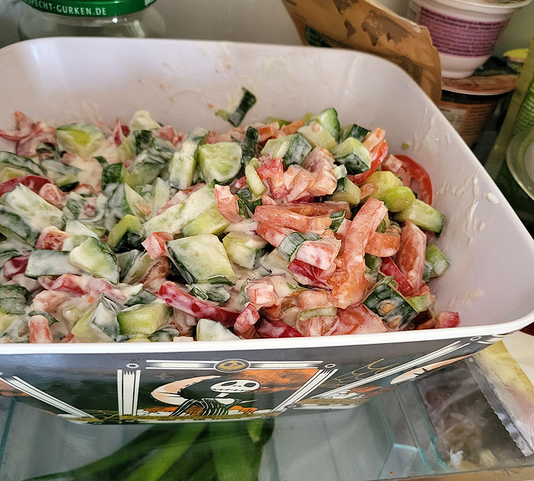 Салат самый простой. Огурцы, помидоры, болгарский перец, зеленый лук. Заправка что-то типа сметаны. И посолить.