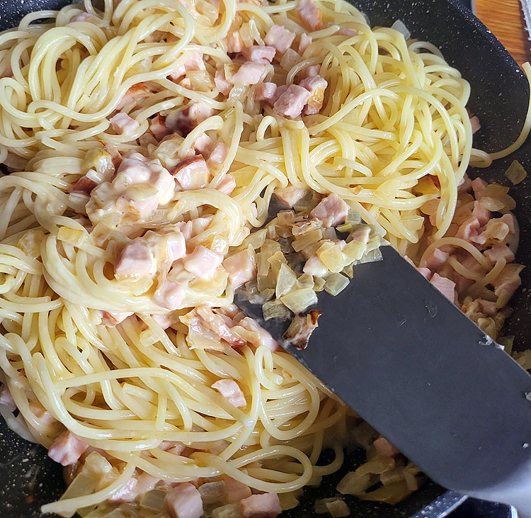 Короче, пока спагетти варятся, жарим лук и добавляем сюда же порезанное мясо кубиками. Прогреваем. Потом добавляем сметану (или йогурт) и всякие специи по вкусу. Чуть-чуть прогреть, и тут как раз спагетти сварились – их добавляем, если соус густоват – то можно водички из спагетти сюда капнуть. Хорошенько прогреваем все вместе, заодним перемешиваем.