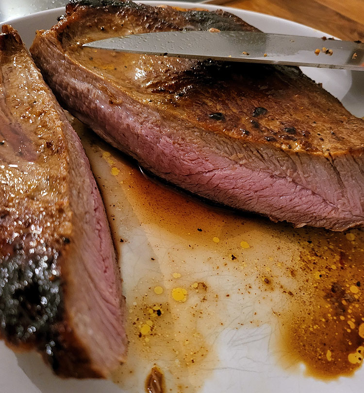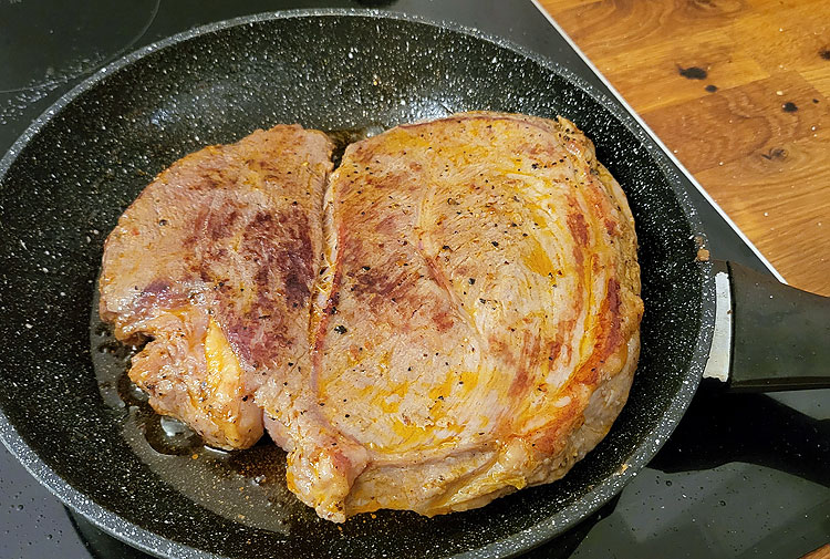Или вот. Купила вот такой кусман мяса – пожарила (на сухой сковороде) этот кусок. Поскольку кусок для меня нетипичный, я ориентируюсь не на время, а на кухонный термометр. (Грудки я жарю по времени – так проще, если примерно время знаешь).