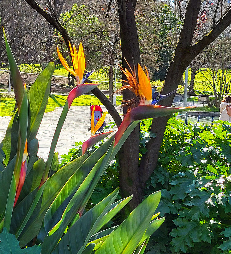 У нас в Мексике во дворе постоянно цвели стрелиции (так что мы их хорошо знаем – прямо наблюдали как они цветут), намного крупнее тех, что в Бильбао или тех, что мы видели в Порту. Прямо намного крупнее. Но без этих смешных синих хохолков. Не так на петухов похожи.