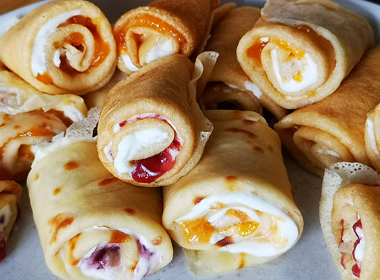 Муж хотел блинчики с творогом. Так что были ему с творогом и вареньем (половина – с малиновым вареньем, половина – с абрикосовым).