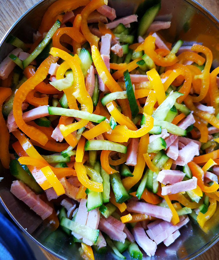 Салат. Ветчина-перец болгарский-огурец. Очень вкусно.
