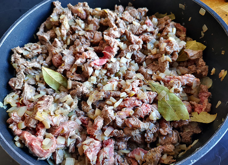 Вот как я обычно выбираю в магазине мясо в готовку? Нет, иногда я заранее знаю, что буду готовить, чего мне хочется -- и подбираю под это подходящее мясо. Но чаще я вообще не знаю, чего мне хочется приготовить, и иду в магазин наобум: увижу чего-нибудь интересненького -- его и приготовлю. Интересненькое обычно оказывается то, что по акции. (Обратите внимание: не то, что самое дешевое, а то, что по акции! А то были бы у нас только куриные бедра ))) Вот, например, была говядина по 5 евро за кг -- превратилась в бефстроганов.