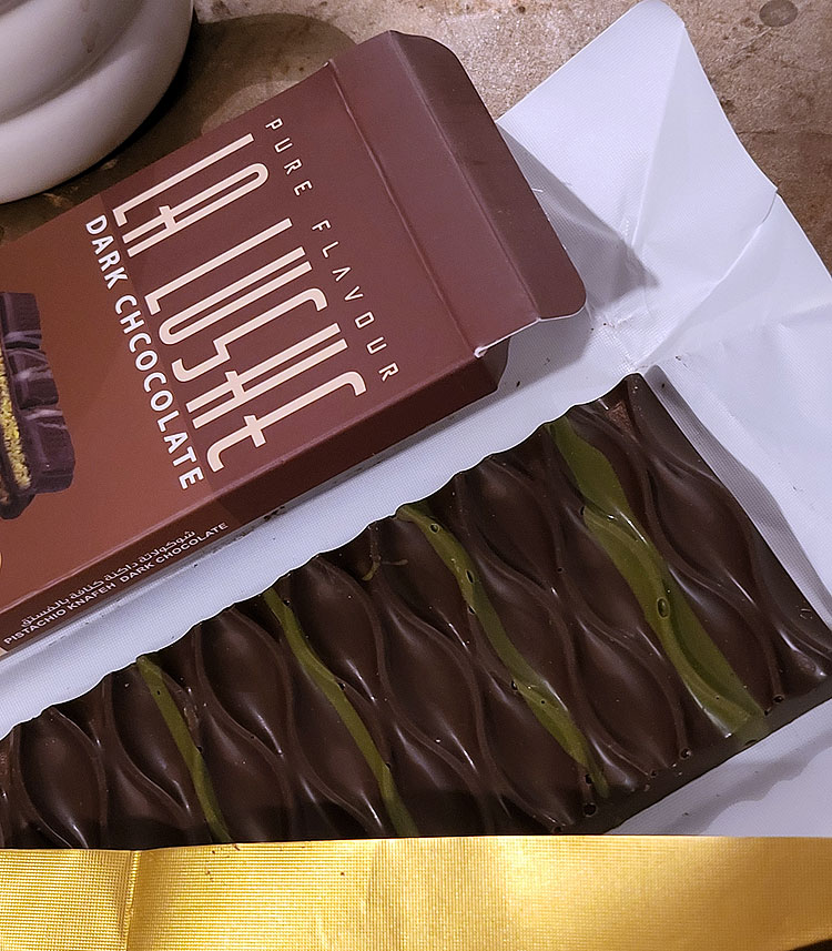 Кто пока не узнает -- на картинке дубайский шоколад, который мой муж мне притащил с работы. А мужу подарил коллега из Дубая (шоколад там и куплен в Дубае). Что самое смешное, муж про хайп вокруг дубайского шоколада вообще не слышал.