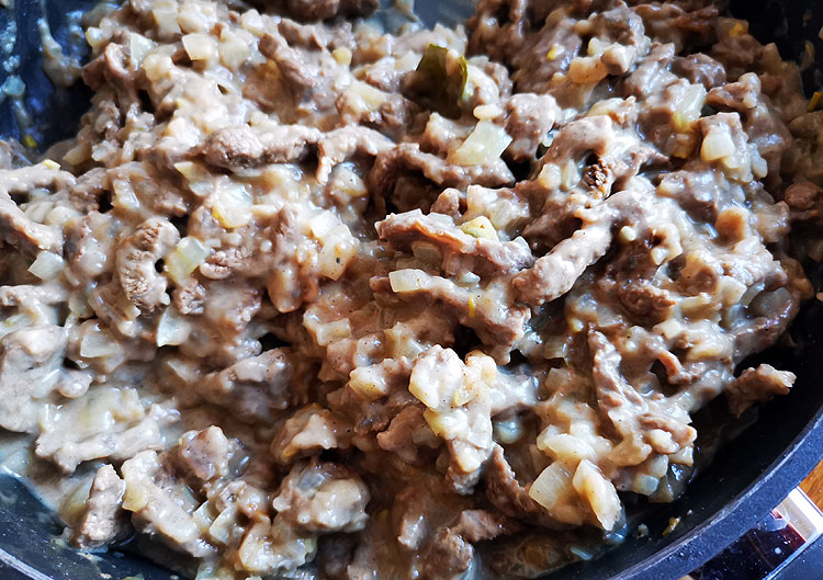 Это в готовом виде. Блюдо не слишком фотогеничное, конечно, но очень вкусное. Очень люблю бефстроганов. И из говядины чаще всего готовлю именно его. Потому что говядина вообще для меня сложное мясо -- не дружу я с ней. Мне она всегда кажется недостаточно мягкой. А в бефстроганове чаще всего хорошо.