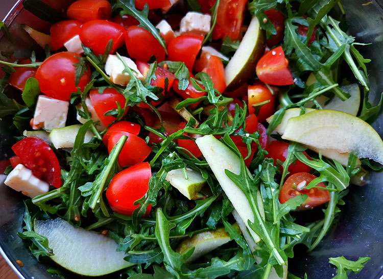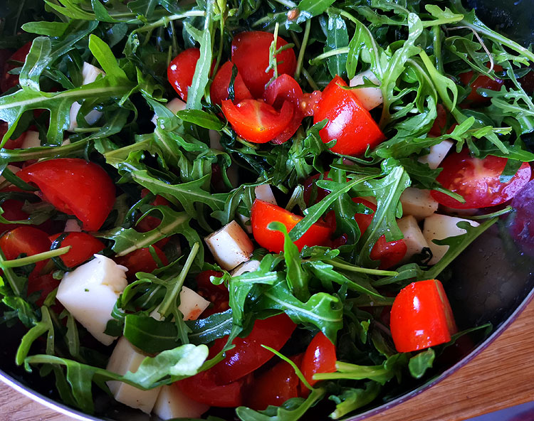 Ну, и вот. Но когда у меня в доме собрались помидорки-черри и руккола, я еще второй салат делала. Он по виду очень похож, а по вкусу – даже побогаче.