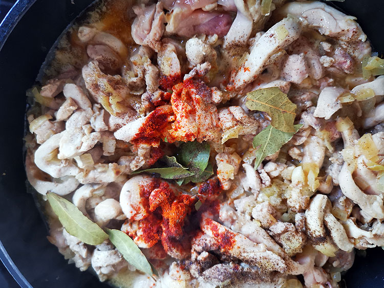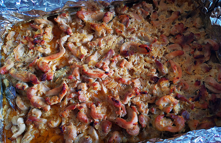 К сожалению, у меня сейчас нет посудины, которую можно и сверху печки, и внутри использовать, поэтому я в процессе переложила. И в этом перекладывании -- прямо половина трудоемкости приготовления. Так-то блюдо вообще простое. И очень вкусное: сегодня доели, муж велел завтра повторить.