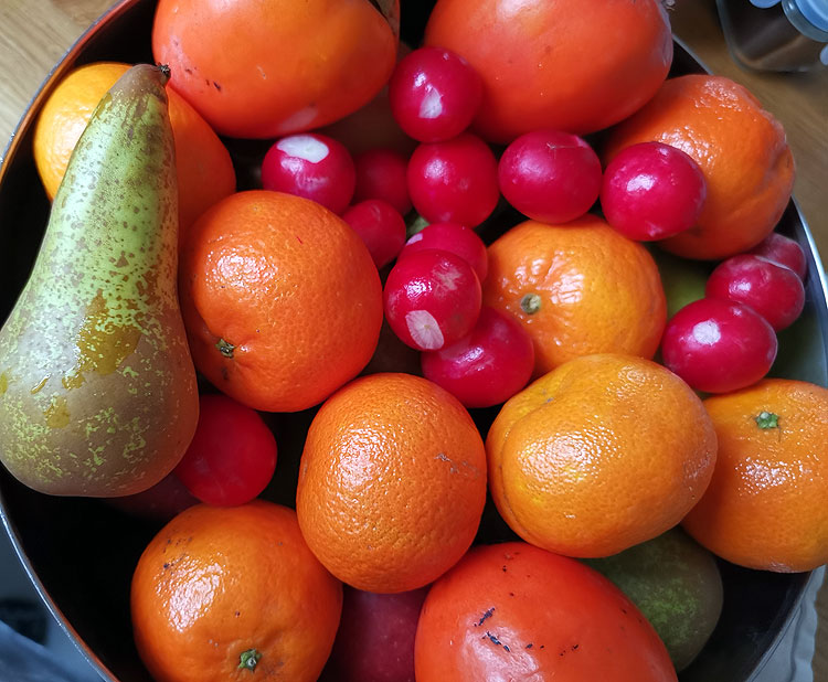 Фруктовая миска. У нас в доме есть небольшая горка уже мытых фруктов, откуда постоянно можно цапнуть, что хочешь уже без дополнительных заморочек. Если мы ужинаем перед фильмом, например, это эта миска перетаскивается туда -- там цапаем.