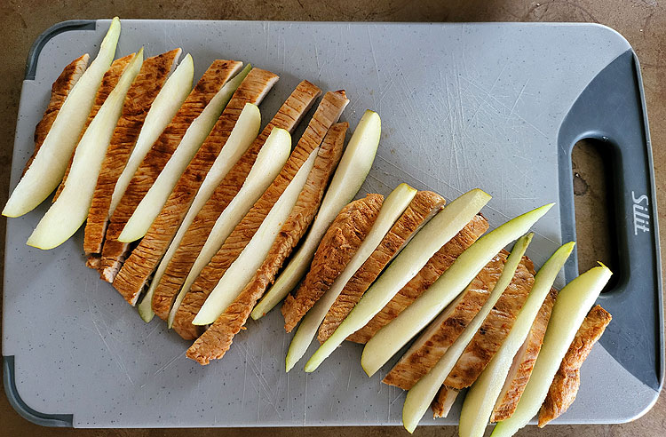 Это вчерашний стек порезан на полоски, между полосками – кусочки груши. Подается холодным. Такое вот “бутербродничание”.
