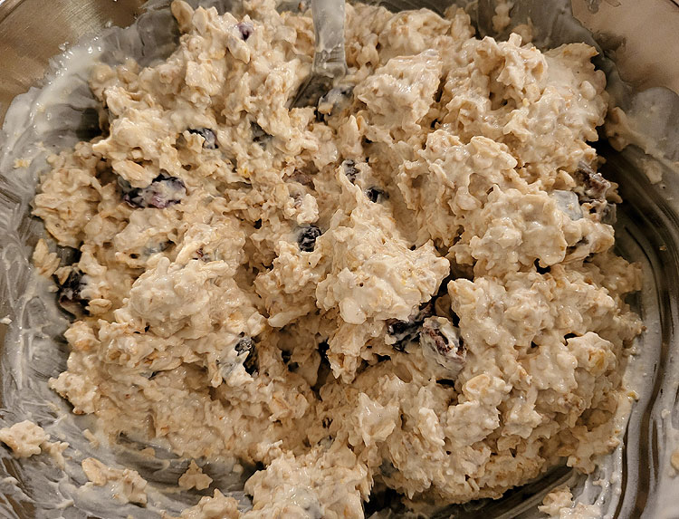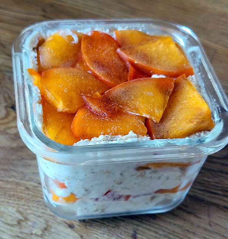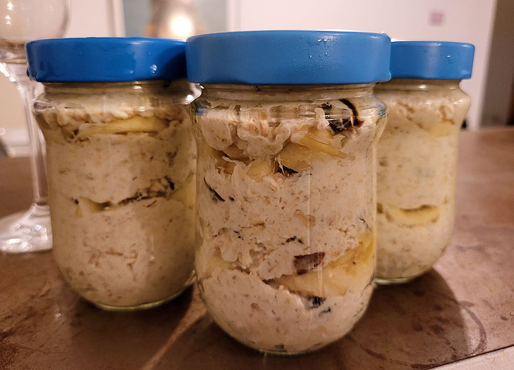 Напоминаю рецепт. В миске смешать овсянку и сметану (йогурт или еще что-то подобное), сухофрукты (можно заменить на варенье), и по вкусу подсластить. Можно добавить корицы или других "десертных" специй (миндаль, кориандр, имбирь... -- ну, на ваш вкус, можно какую-то готовую смесь типа "для тыквенных пирогов"). Потом массу разложить по банкам, прокладывая слои фруктами. Мой муж больше всего любит с бананом.