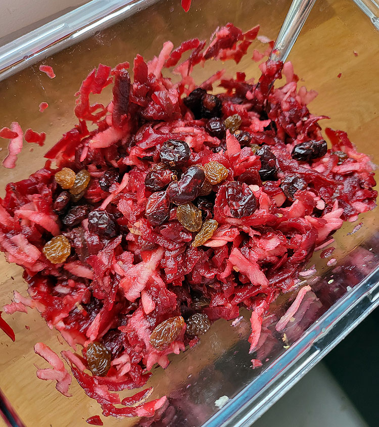 Тертая свекла и яблоко, изюм, чеснок. Заправить небольшим количеством лимонного сока.