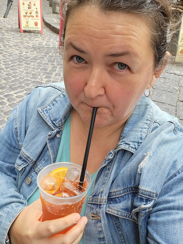 Мы брали навынос, прямо с ним и гуляли по улицам (в Италии нет запрета на распитие алкоголя на улице; в Германии тоже). Мой вердикт: этот самый шприц-апероль проще приготовить дома. )) Но в Германии еще, наверное, месяца два на него тянуть не будет -- все же это очень летний напиток.