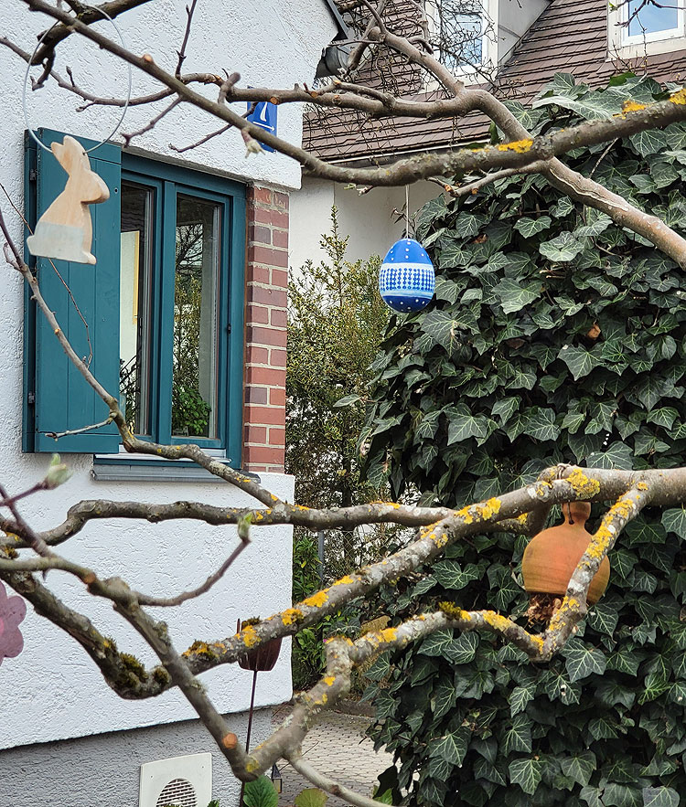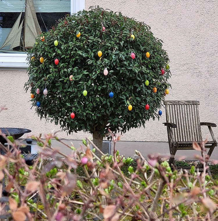 Не цветущее дерево, но начало появляться. Тут, в Германии, наряжают деревья не только к Рождеству, но к Пасхе тоже.