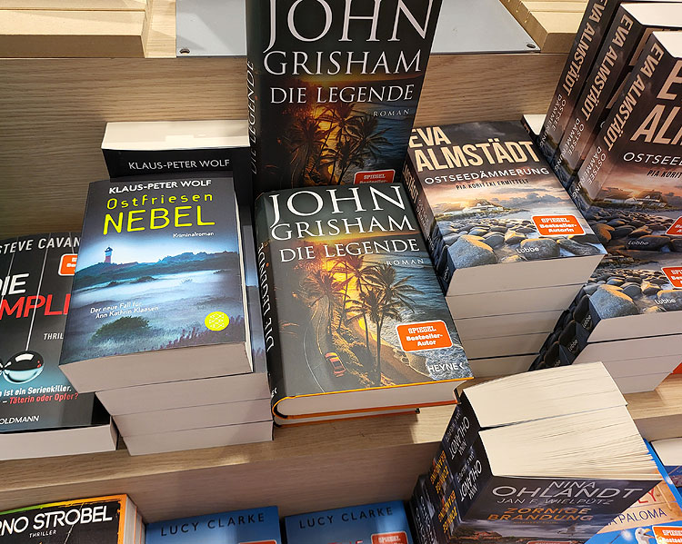 - Джон Гришэм почему-то встречается вообще во всех странах, почти во всех книжных. Если честно, я не понимаю, почему. Не все авторы так часто встречаются. А Джон Гришэм -- прямо его очень легко встретить. На любом языке.