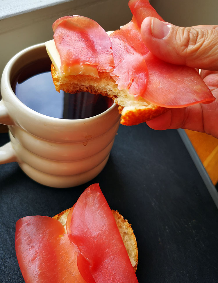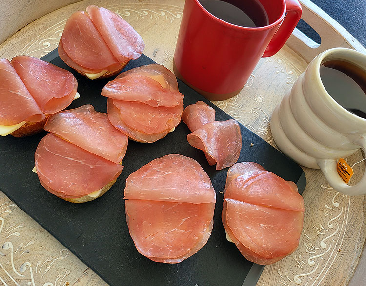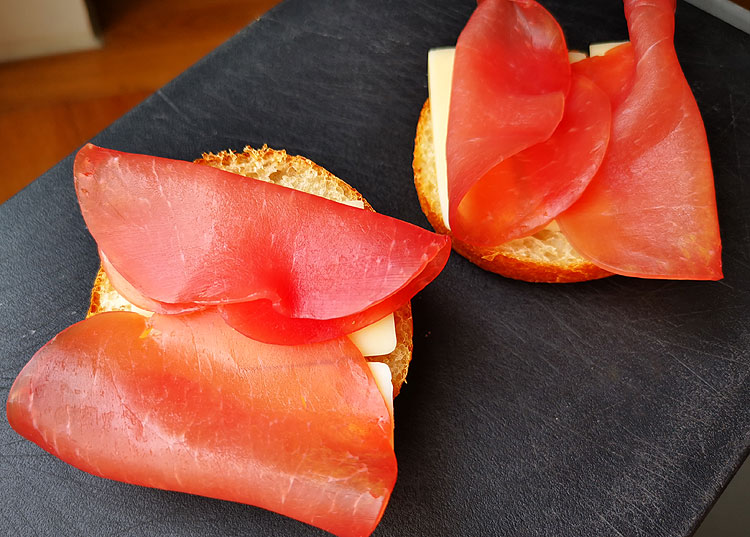 В качестве мяса у меня тут одно из любимых местных мяс – Lachsschinken. В немецкой википедии написано, что это типичное французское сыровяленое мясо, но как оно называется на французском – не написано.