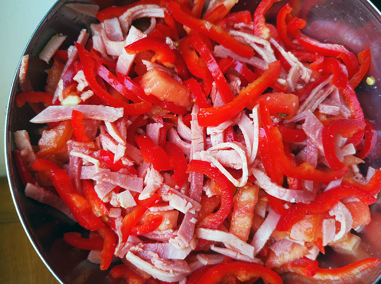 Салат “пикантный”. Помидор, перец, ветчина. И посолить-поперчить.