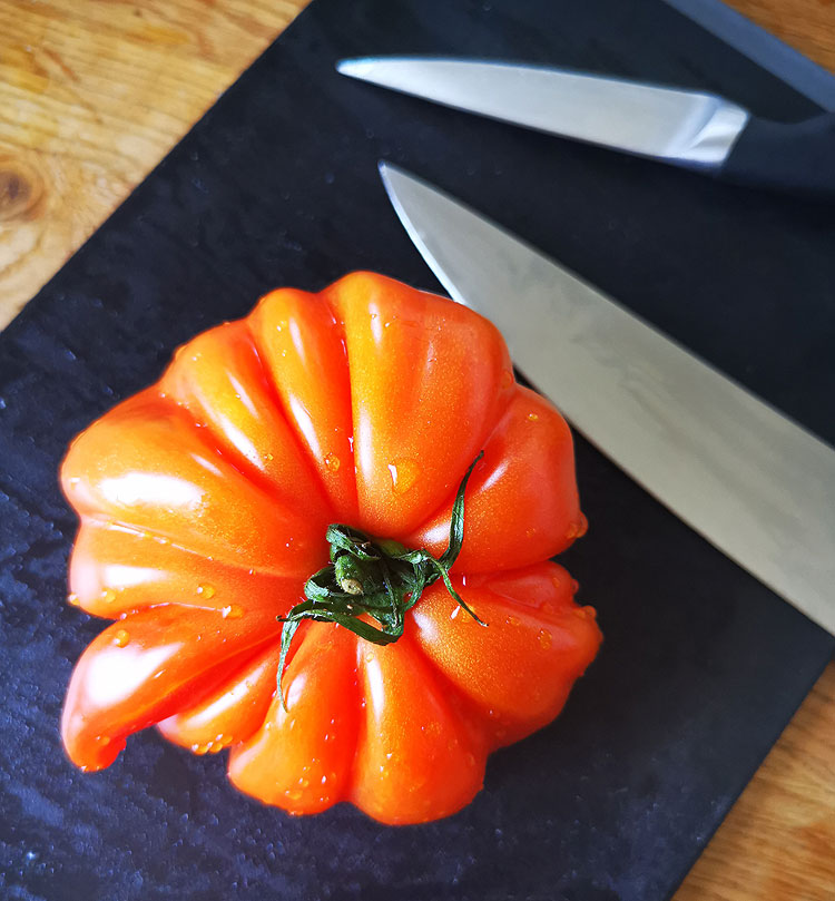 Помидоры в этот салат почему-то вкуснее недозрелые, не зеленые, но еще не красные, не успевшие стать сладкими. В Омске я такие помидоры могла только на даче застать. В Германии вполне реально найти такие помидоры в ближайшем супере у дома.