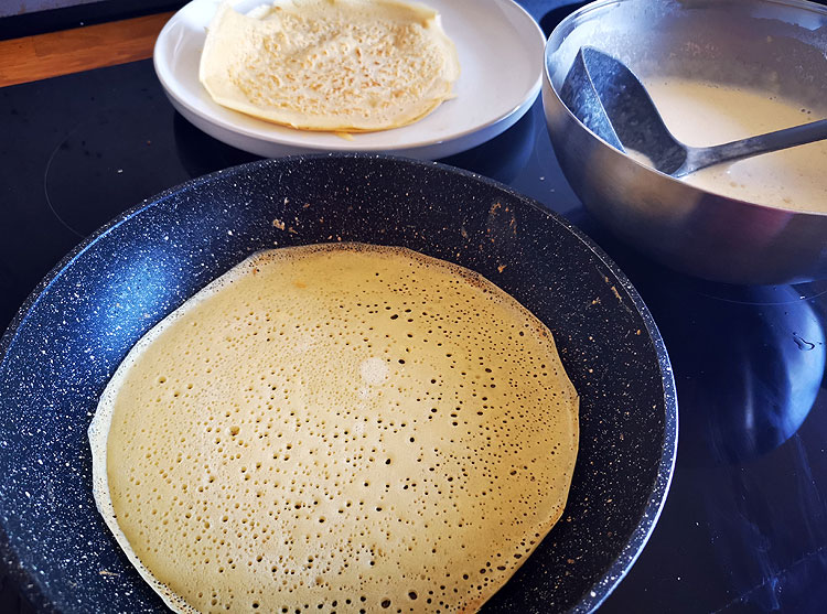 Тесто красиво пузырится, но в целом технология и замешивания теста, и выпекания блинчиков – такая же, как обычно.
