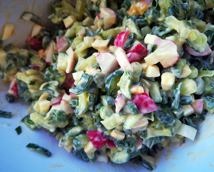 В качестве летних гарниров у меня часто бывают салаты. Здесь почти тот самый салат летний. (который как окрошка). Почти – потому что картошки в доме не было, это салат без картошки. Без картошки этот салат, оставаясь очень вкусным, по КБЖУ смещается от У к Б – что тоже для теплого времени года неплохо.