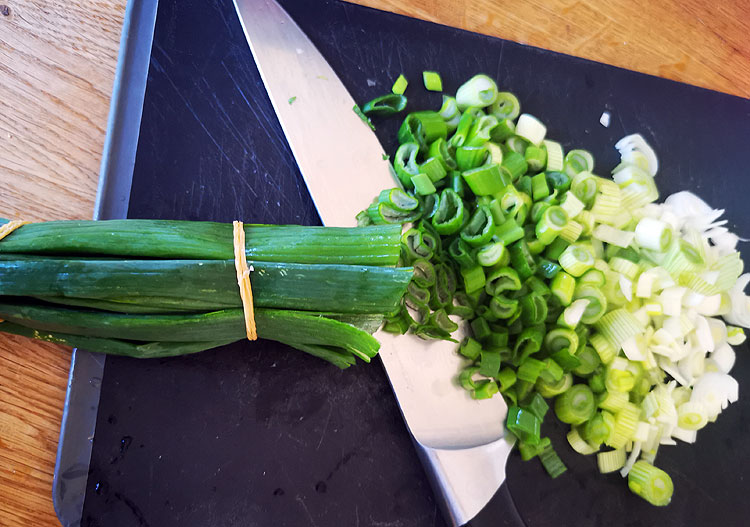 А вот такой лайфхак еще не показывала. В местных магазинах зеленый лук продается пучками, а пучки перехвачены канцелярскими резинками. И вот так лук резать очень удобно.