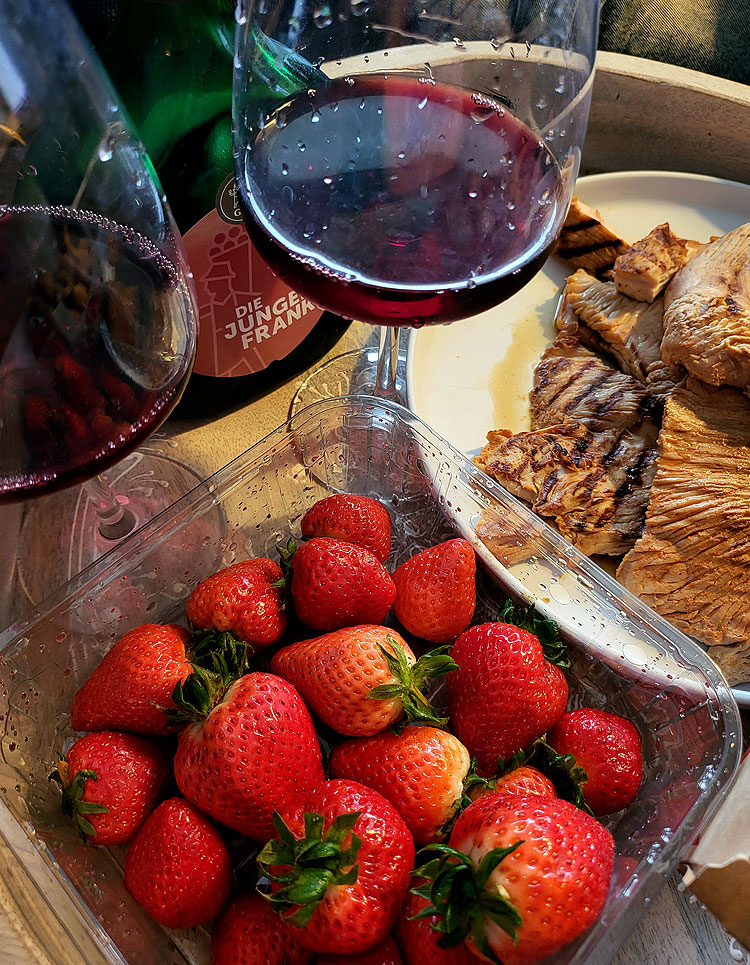 Ну, тут вообще рассказывать особенно нечего. Шампанское, клубника, и так по мелочи. Клубника пошла очень хорошая. А в роли шампанского на фото вино с названием Нимфенбург – это ближайший к нашему дому дворец баварских королей.
