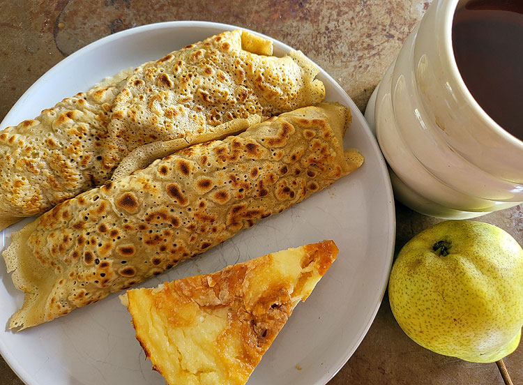 Здесь в блины завернуто порезанное тонко мясо с тонкими полосками лука и небольшими кусочками сыра. Ну, и кусочек творожной запеканки.