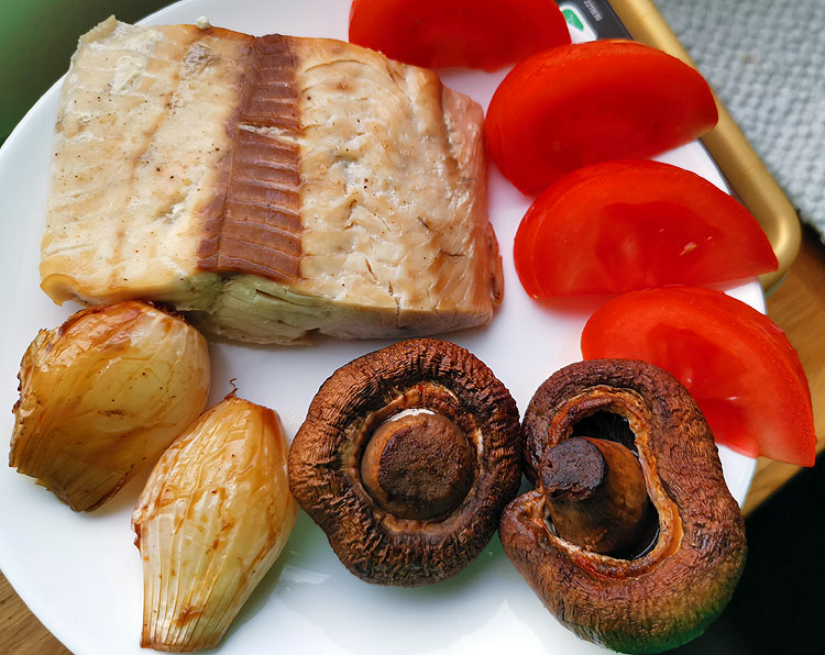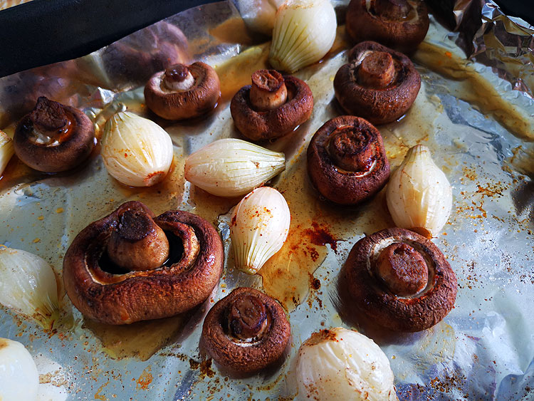 Шампиньоны после духовки существенно меняют цвет. Лук – просто мягчеет (должен спокойно прокалываться вилкой).