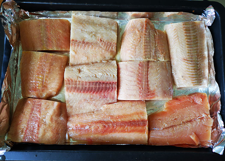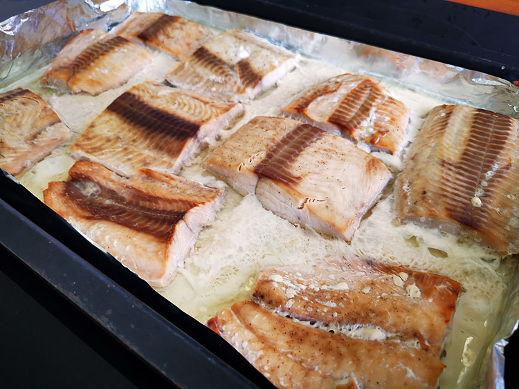 Рыбку посолить-поперчить. Можно сбрызнуть лимончиком. В духовку на полчаса.
