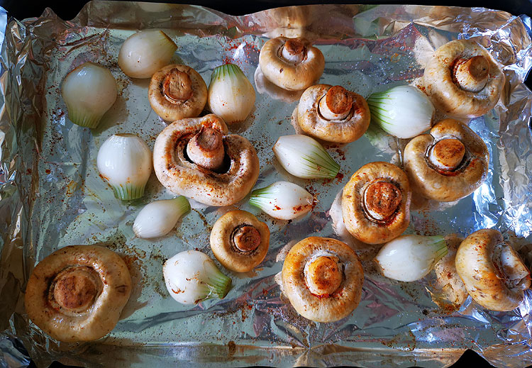В данном случае, как вы видите, у меня лук идет в духовку вместе с шампиньонами. Шампиньоны сбрызнуть немного раст.маслом, посолить, поперчить.