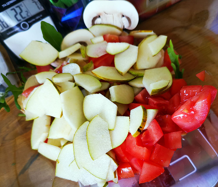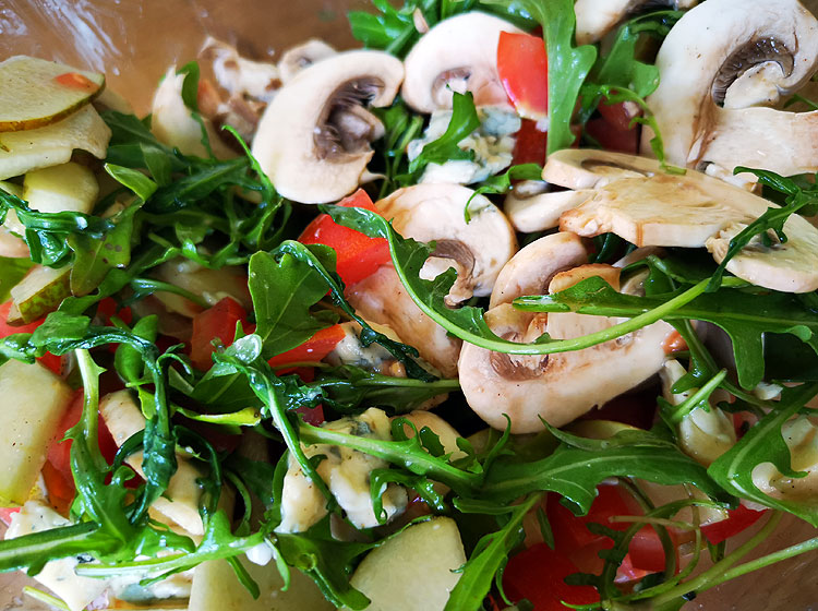 Кроме рукколы свежие шампиньоны (только вымыть), помидоры (должны были быть черри, но взяла просто на ветке – тоже пойдет), груша, горгонзола – взяла побольше, чем в первый салат (для агрессивности как раз).