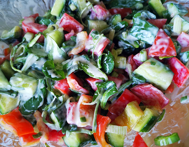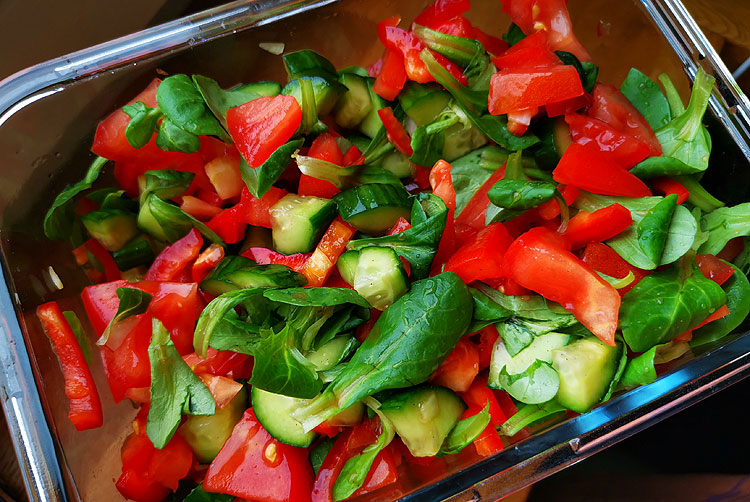 Огурцы, помидоры, болгарский перец, feldsalat (Валерьянелла). Посолить, поперчить, оставить в покое – есть, когда салат даст сок. Будет очень вкусно.