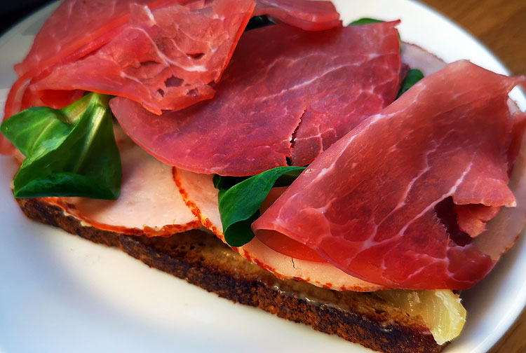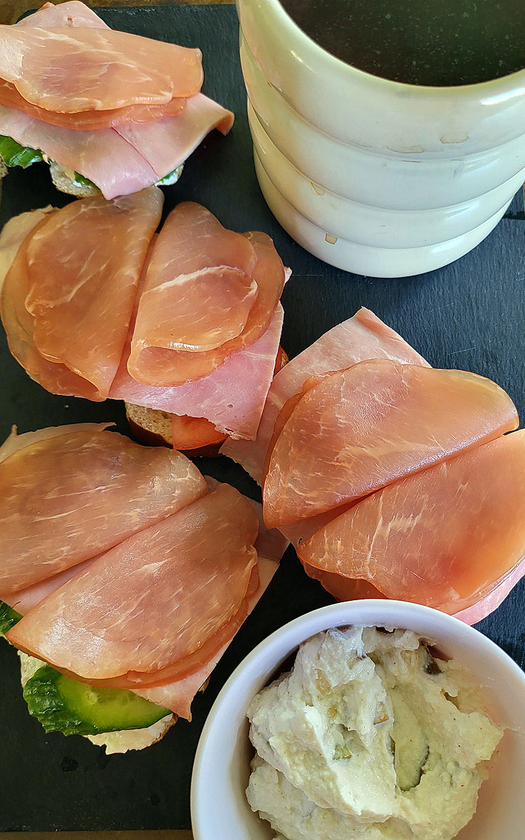 Бутерброд очень похожий, только самые внимательные могут заметить, что нижнее (ровное) мясо другое. А верхнее – такое же. Очень я люблю Lachschinken, поэтому оно тут почти везде.