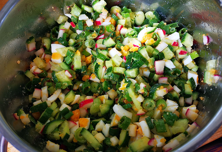 Обещала же, что будет упор на салаты. А пока салатов и не показала. Это самый обычный, летний, только без картошки и без мяса (просто с картошкой не хотелось возиться, а мяса в доме подходящего не было). А все остальное -- просто покрошить (зеленый лук, яйцо, редиска, огурец). Заправить потом сметаной.