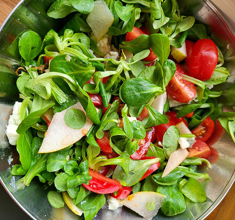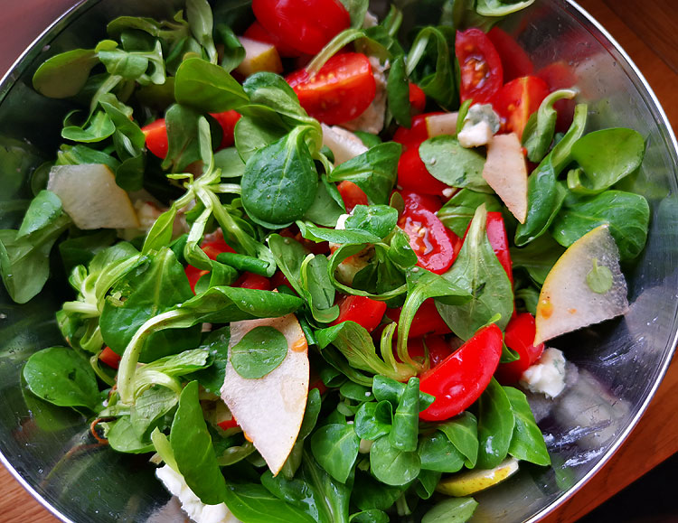 Feldsalat, груша, помидоры черри, горгонзола. Посолить, поперчить, перемешать. Больше ничем не заправляла.