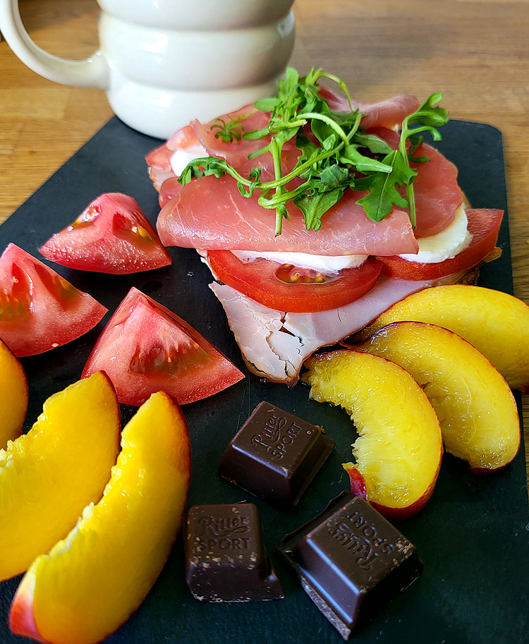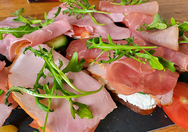 Бутерброд: хлеб - два вида мясной нарезки - помидоры черри - сыр handkäse. Хлеб тут серый, называется картофельный.