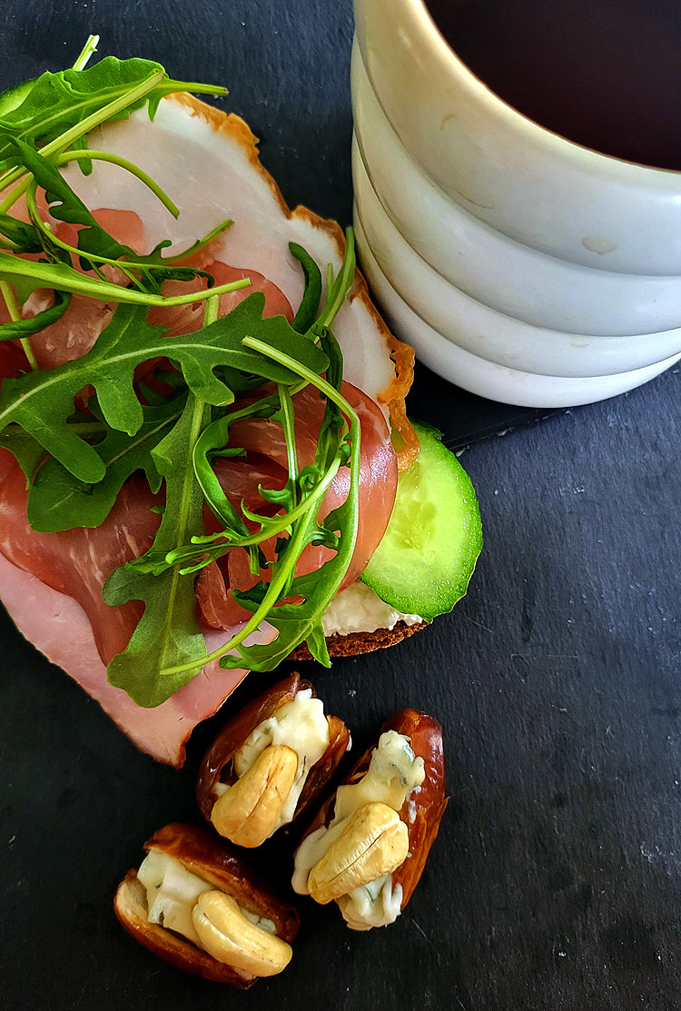 И тут еще парочка “конфеток”. Финики, фаршированные горгонзолой, и еще с орешком.