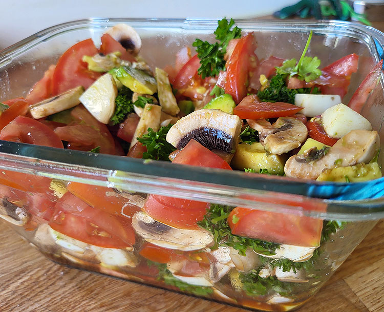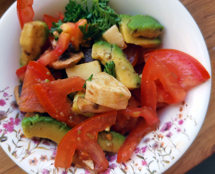 В салате: помидоры (лучше бы черри -- но были обычные); моцарелла -- лучше бы мелкими шариками, но была большим шаром -- порезала кубиками; шампиньоны сырые; авокадо (в магазинах продается неспелое, надо дома доводить до зрелости); в роли зелени -- петрушка.