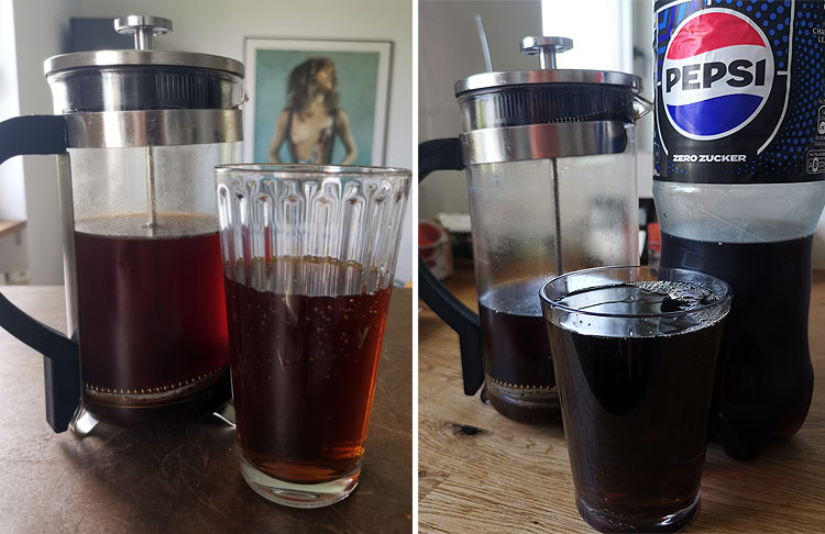 Мне одинаково кока-кола и пепси. То есть, я чувствую разницу во вкусе, у меня нет между ними четкого разделения кто лучше, а кто хуже. Пьем мы то одно, то другое – как раз потому что есть разница во вкусе, больше разнообразия. Конкретно в случае “смешать с крепким кофе” пепси выигрывает – потому что ощутимо слаще. Хотя можно с кока-колой и подсластить на свой вкус. С пепси не получается сладко, даже еще остается ощутимая горечь кофе. И у меня это, скорее, по графе “холодный кофе” проходит, чем по графе “сладкий напиток”. Кстати, можно этот напиток “кофе с газировкой” делать с фантой – тоже хорошо. Моему сыну как раз с фантой заходит.