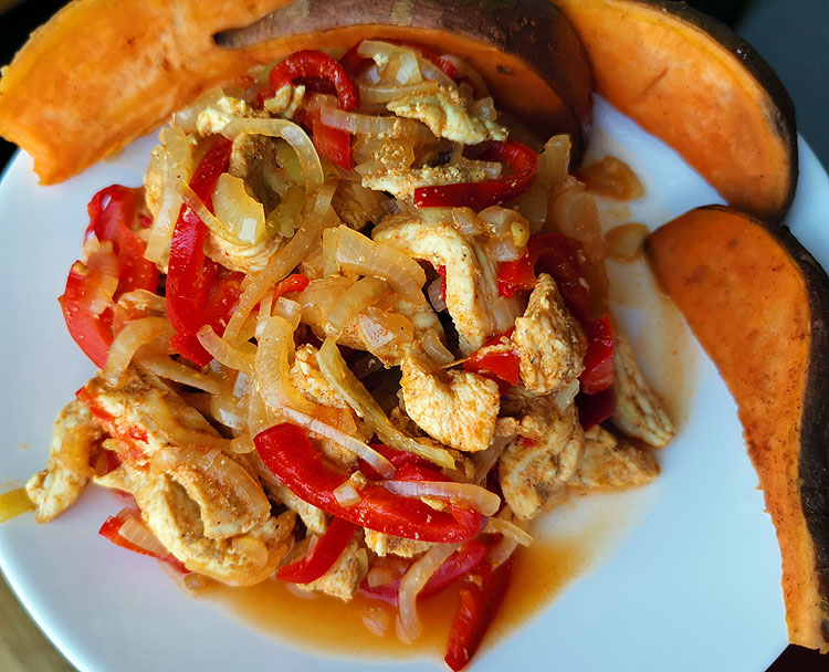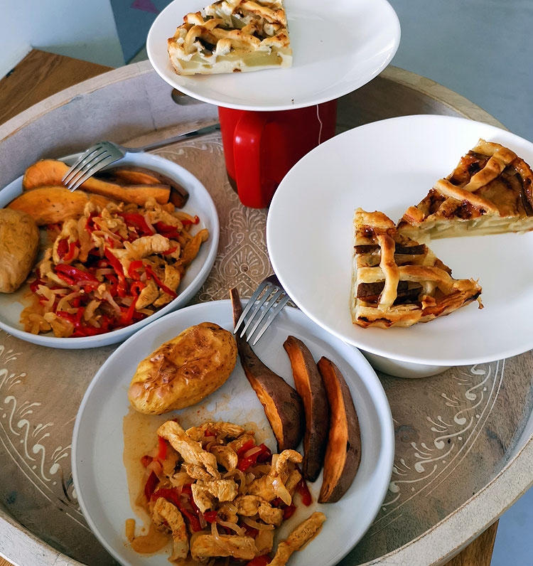 На фото вы видите тот самый пирог с грушей и горгонзолой. А еще -- фахитас. (На гарнир к фахитасу картофель запеченый и батат запеченый).