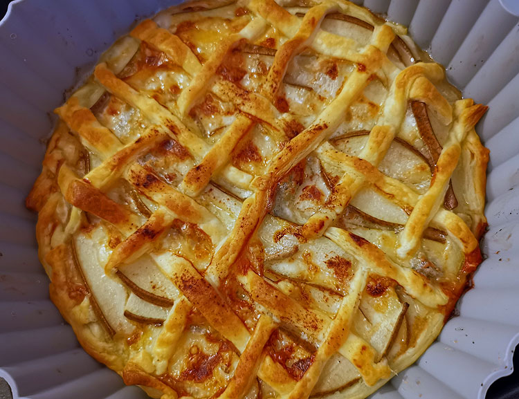 На слоеное тесто раскладываем груши, посыпаем горгонзолой, раскрошенной в руках. Можно взять любой голубой сыр, достаточно насыщенный. Именно поэтому “Бавария блю” сюда не подойдет совершенно, горгонзола – лучше. Дорблю, наверное, еще лучше. (Почему-то у нас не продается).