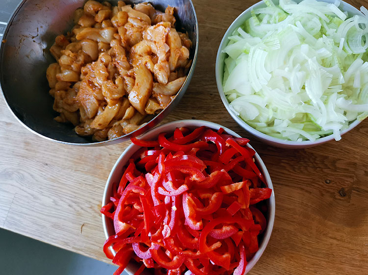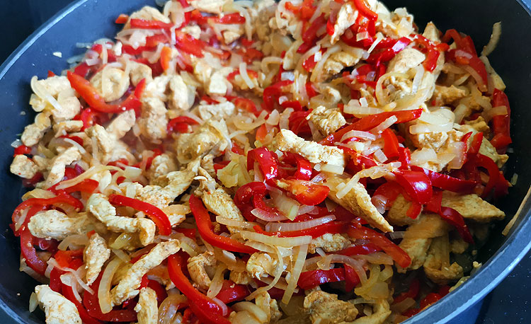 Фахитас за время, прошедшее с последних Вкусных картинок готовила два раза. Поэтому про него поподробнее. Мясо режем ленточками. Насыпаем в мясо приправы (сушеный чеснок, смесь перцев, сушеный лук; мексиканцы ничтоже сумняшеся используют бульонный кубик). Перец болгарский или паприку (мексиканцы смешают болгарский и перец "поблано" в произвольной пропорции) -- режем тоже ленточками. Лук режем ленточками (aka четверть-кольцами). К перцу можно добавить порезанный тоненькими полосочками перец чили, сколько не страшно. Можно регулировать приправами.По объему этих трех основных ингредиентов должно быть поровну. По массе получается лука и перца вдвое меньше, чем мяса.