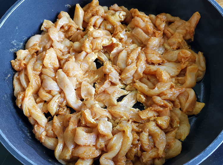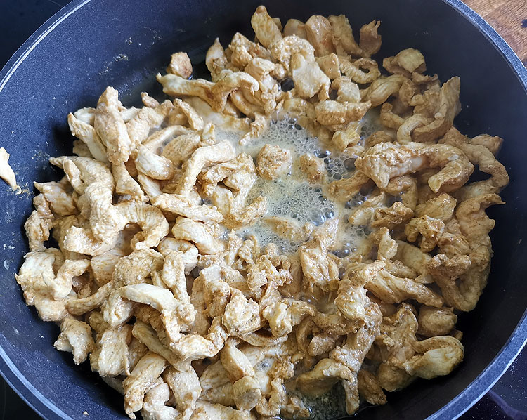 Когда мясо поменяло цвет и выделило сок – оно практически готово. Если полоски достаточно тонкие – это быстро. Мясо вытащить из сковородки, стараясь по максимуму оставить в сковородке сок.