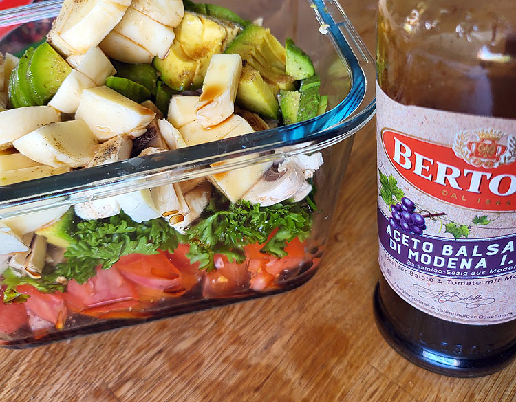 Приправить моим любимым бальзамическим уксусом, посолить, поперчить.