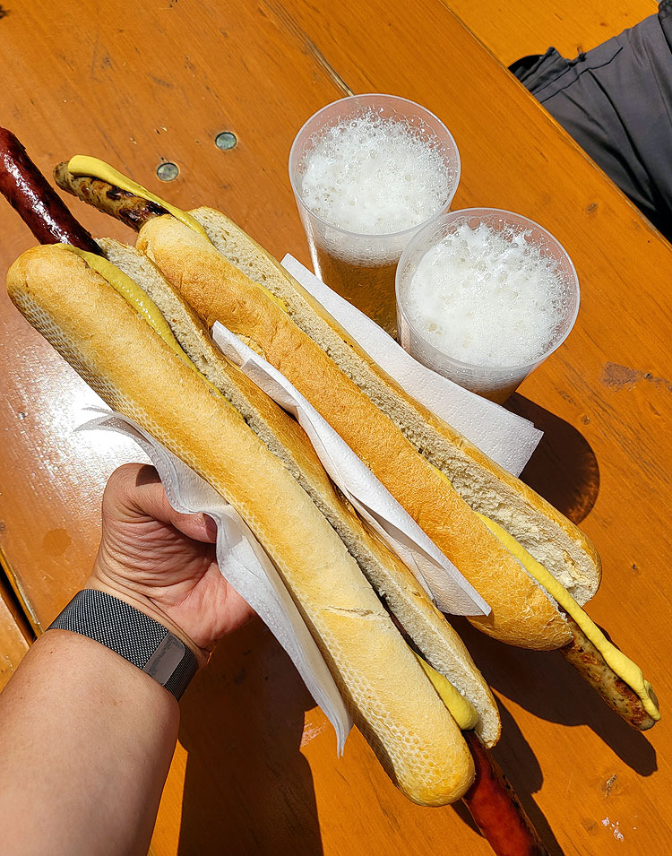 Еще чего вкусного, что не требует готовки (потому что покупается в киоске с уличной едой). В Баварии это, конечно, пиво с сосисками. В роли пива на фото -- радлер. (Немецкая национальная радость: смесь пива с лимонадом).