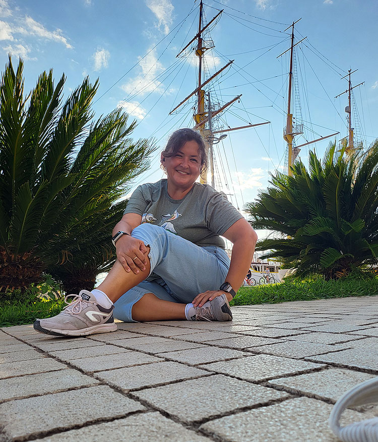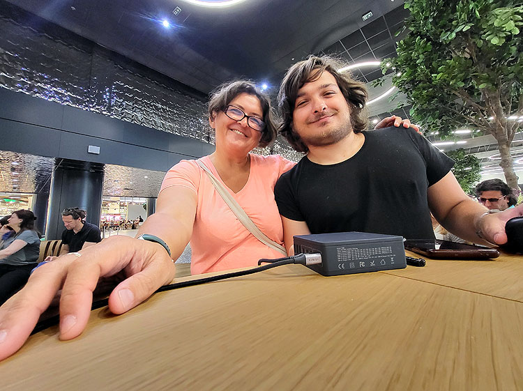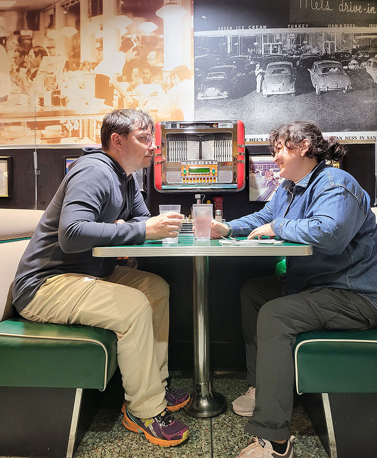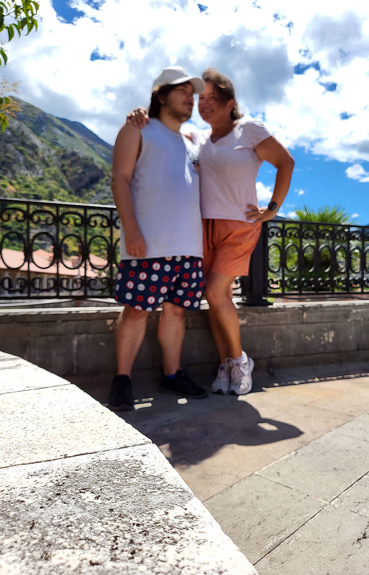А вот еще у нас есть момент, когда мы заказали в кафешке еду, а ее несут полчаса. Прямо удачно время, чтобы запечатлеть себя на память. В каком-то городе, мы счастливые и в путешествии.