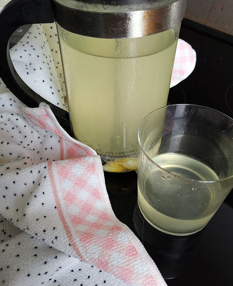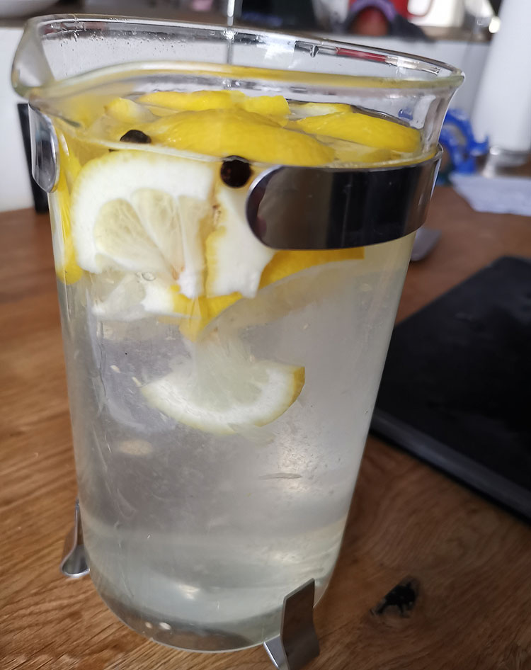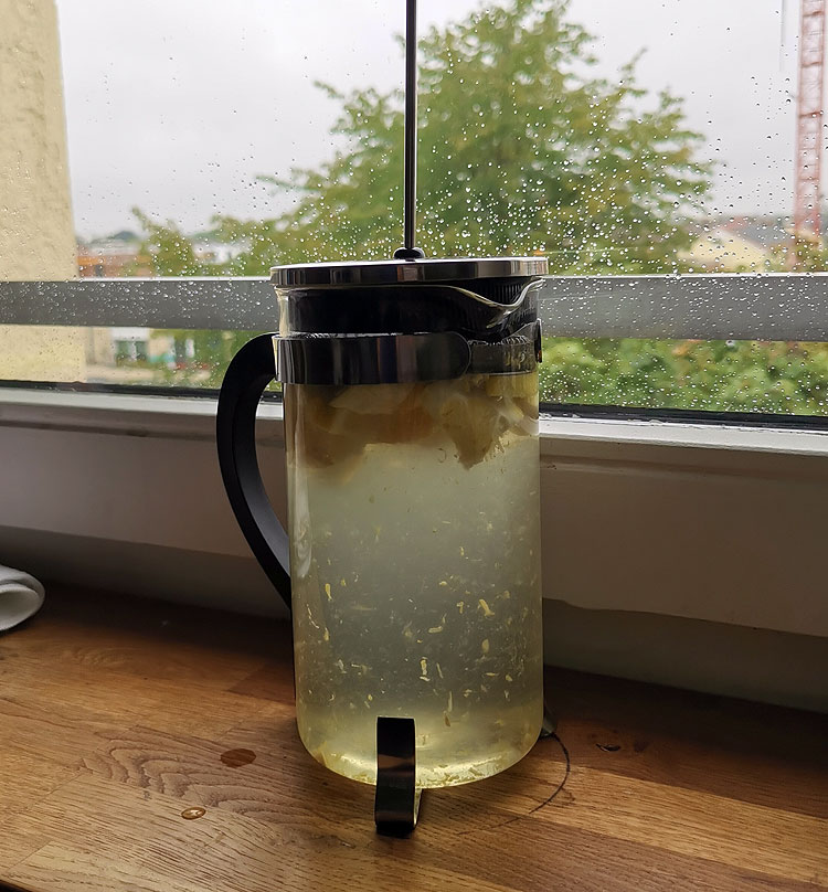 Короче, из половинки большого лимона выдавливаем в чайник сок, натираем на терке цедру, оставшийся жмых тоже режем кусочками – и туда же.