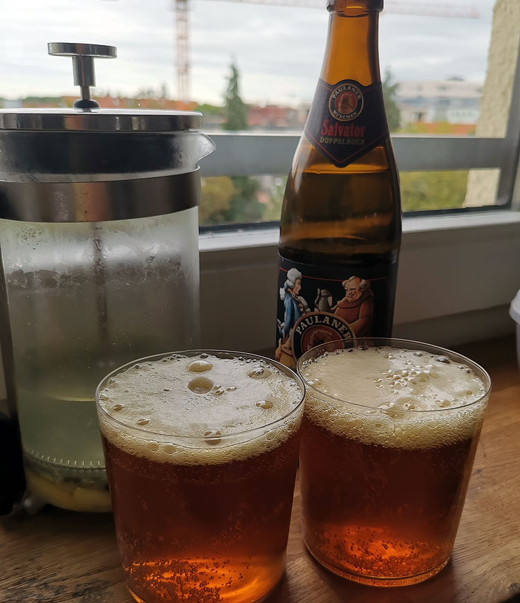 Короче, рецепт в двух словах: максимально простое легкое пиво и максимально вкусный домашний лимонад. Подавать очень охлажденным. Это дает идеальный радлер.