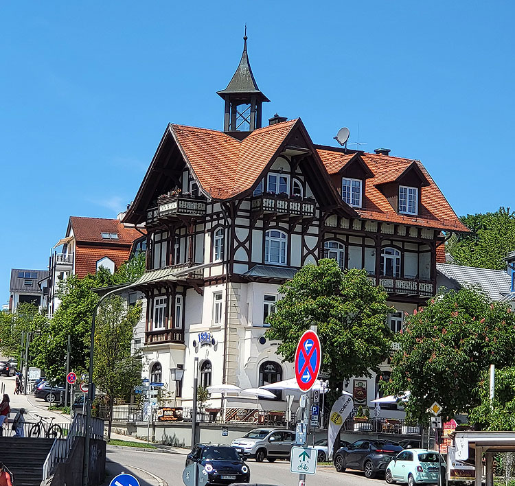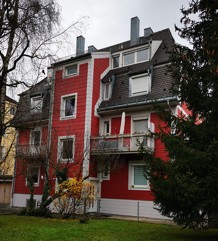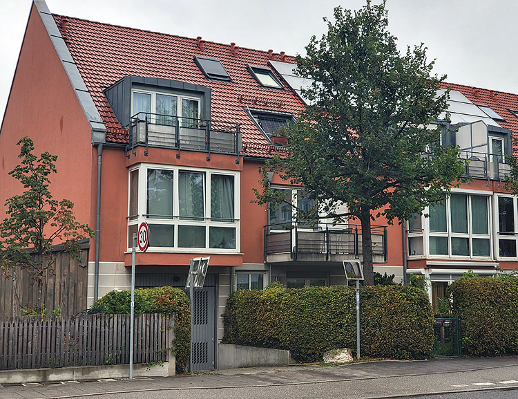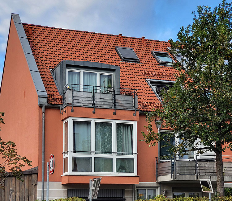 Традиционный немецкий дом – с высокой, очень высокой крышей, покрытой черепицей. Крыша очень высокая, крутые склоны. Сильно выше, чем это привычно в России, например.