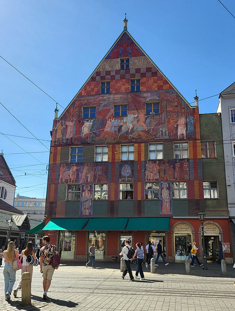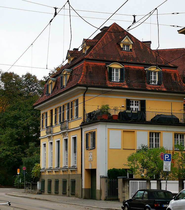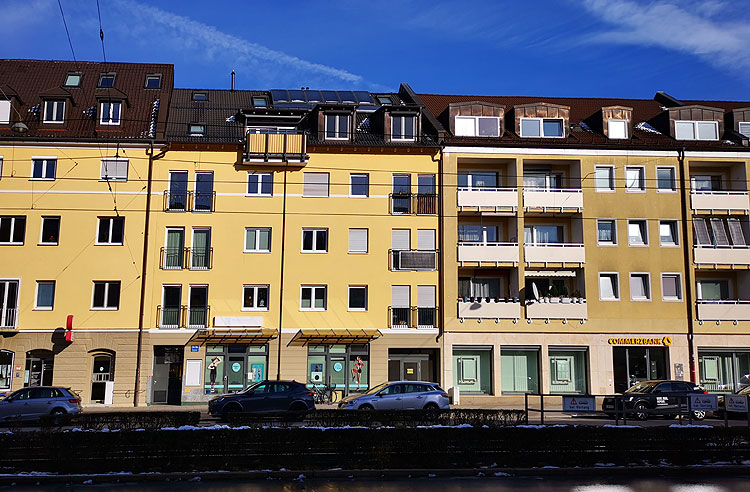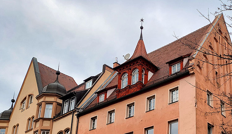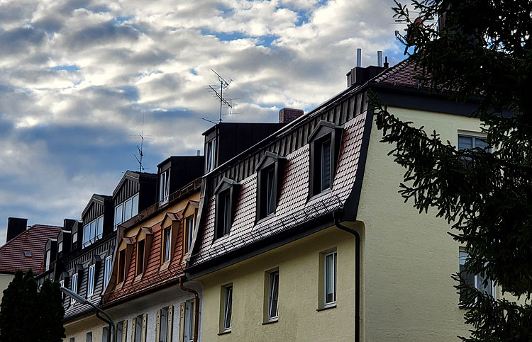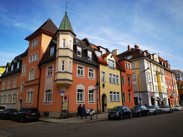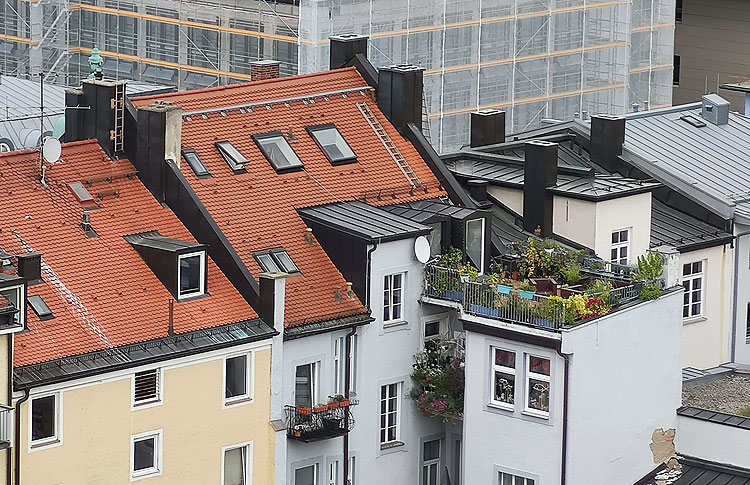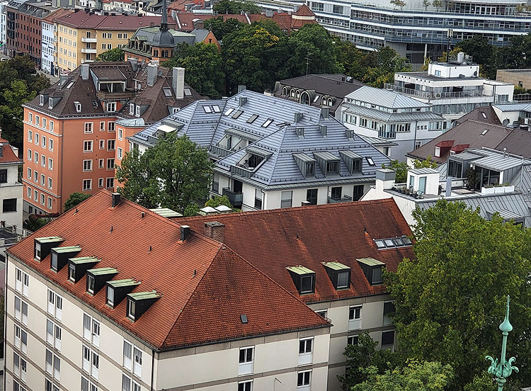 Если честно, сильно высоких домов в Мюнхене мало. Здесь на фото – так и вовсе мало, потому что фотографировать их сложно (особенно, если надо сфотать крышу).