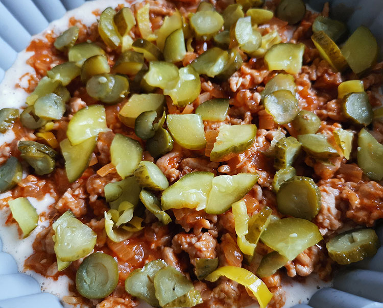 Тесто заливное, любое. Потом фарш, потом соленые огурчики, потом опять залила тестом.